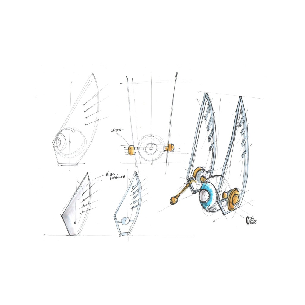 Dans cette interprétation personnelle de la Cocotte de Gabriel Voisin, le vide laisse place au plein et vice-versa, l’acrylique et ses couleurs pimpantes fait place quant à lui à la froideur du métal et à la rigidité de l’Art Déco. Quelques touches de laiton font référence aux m